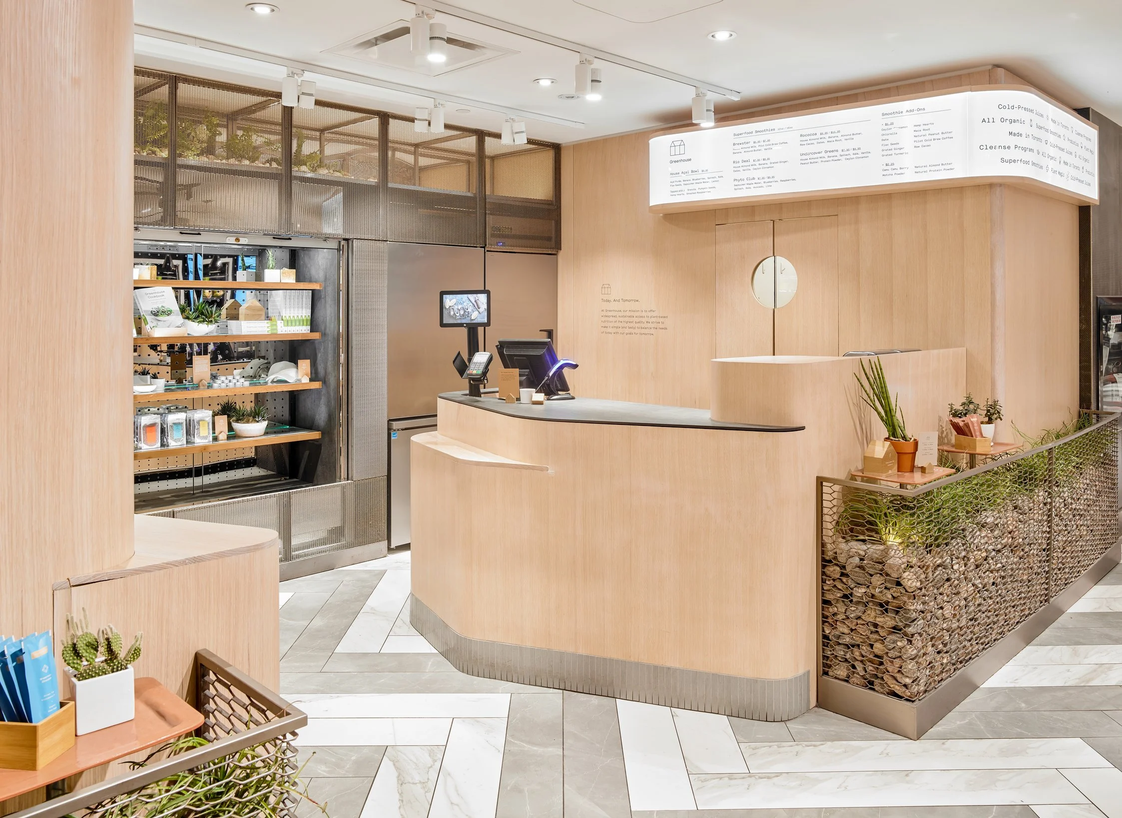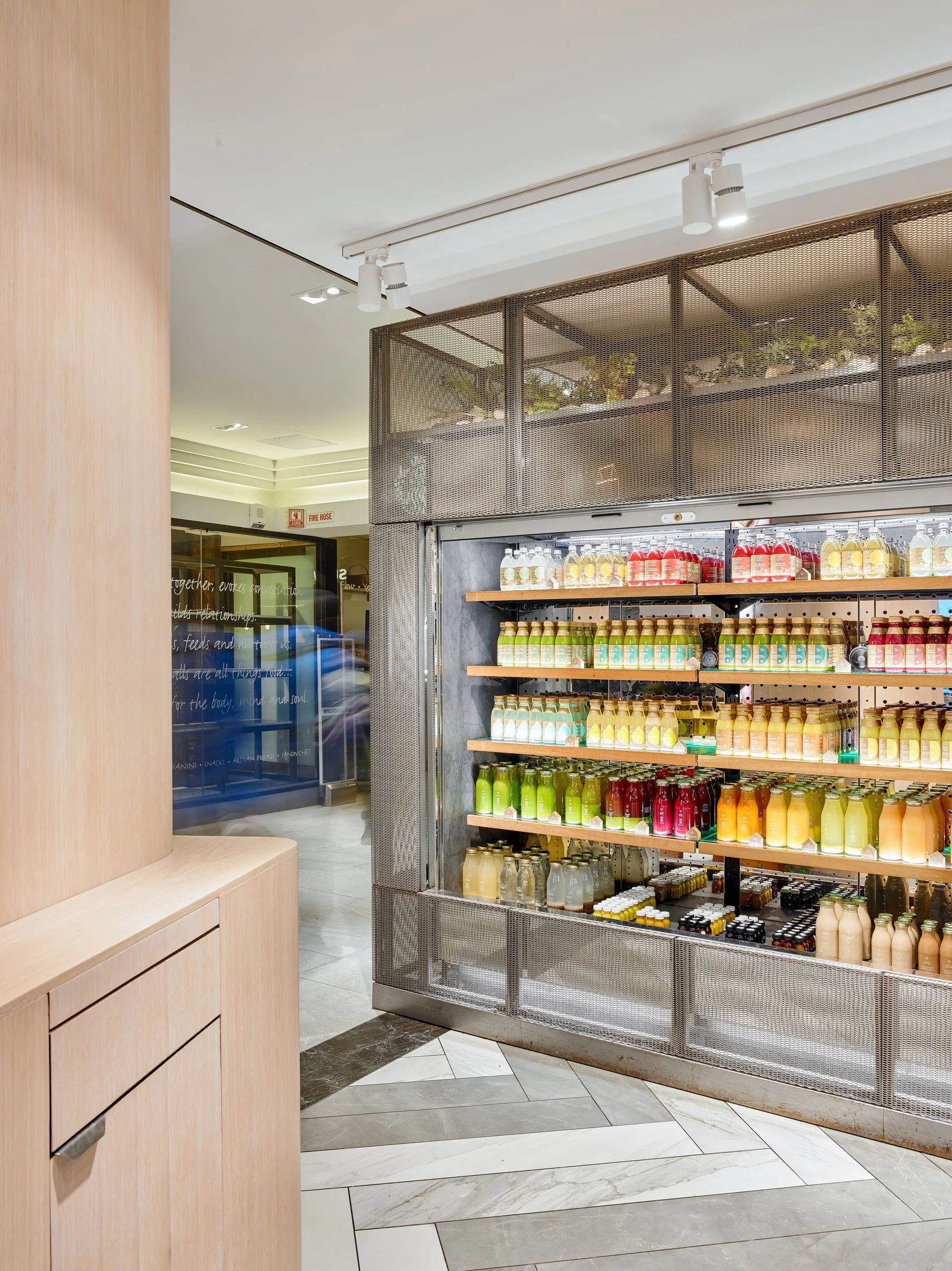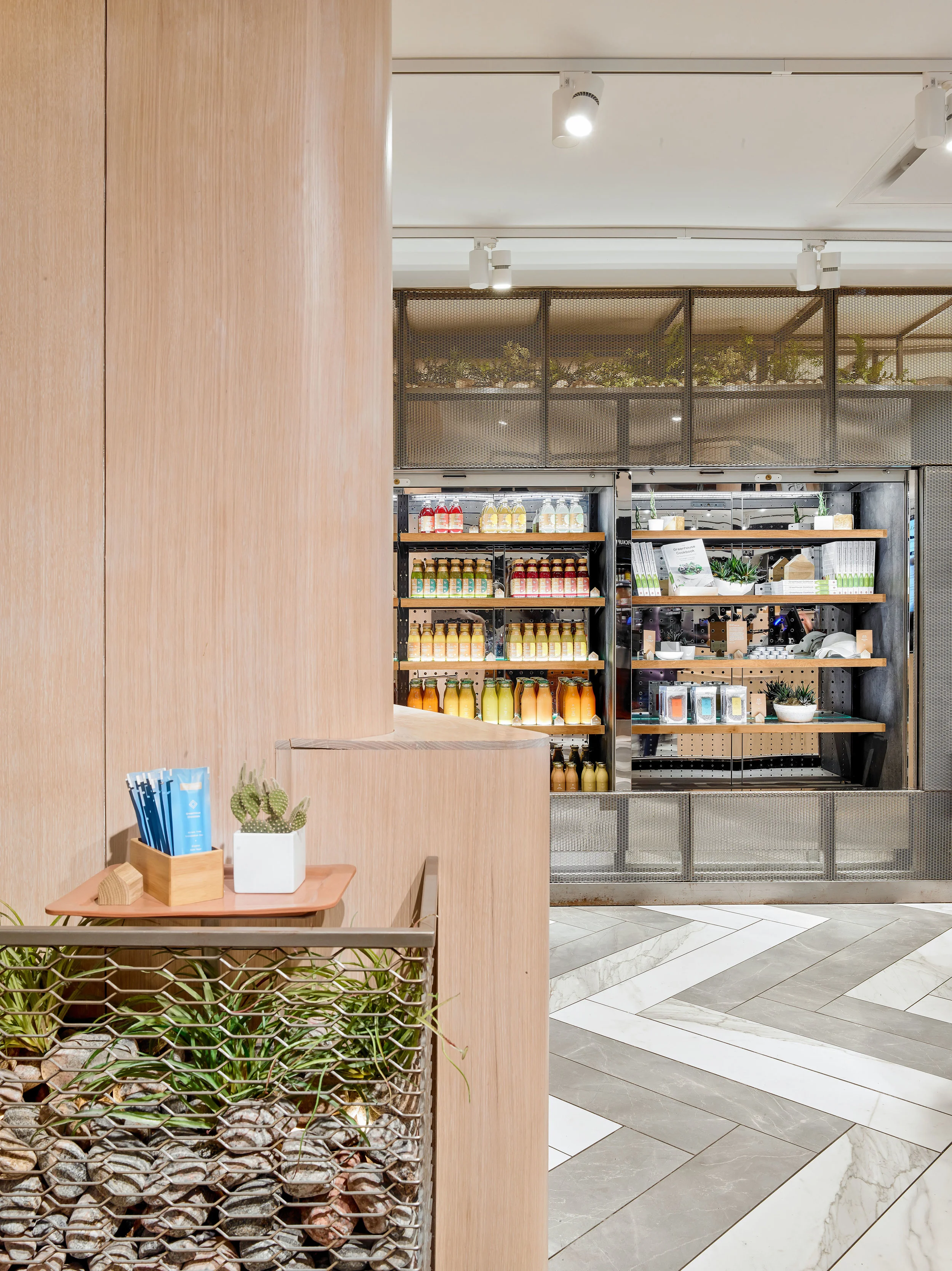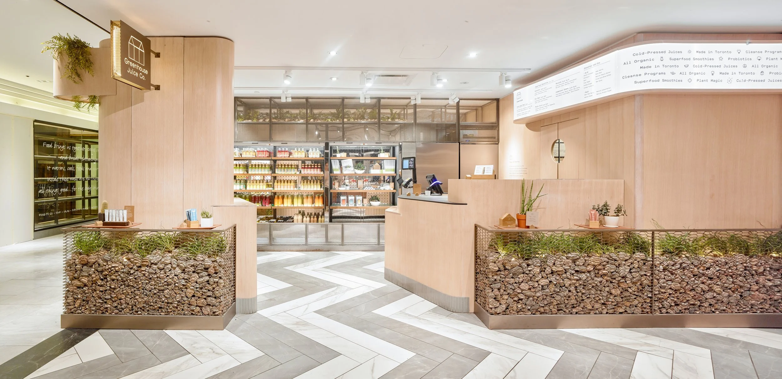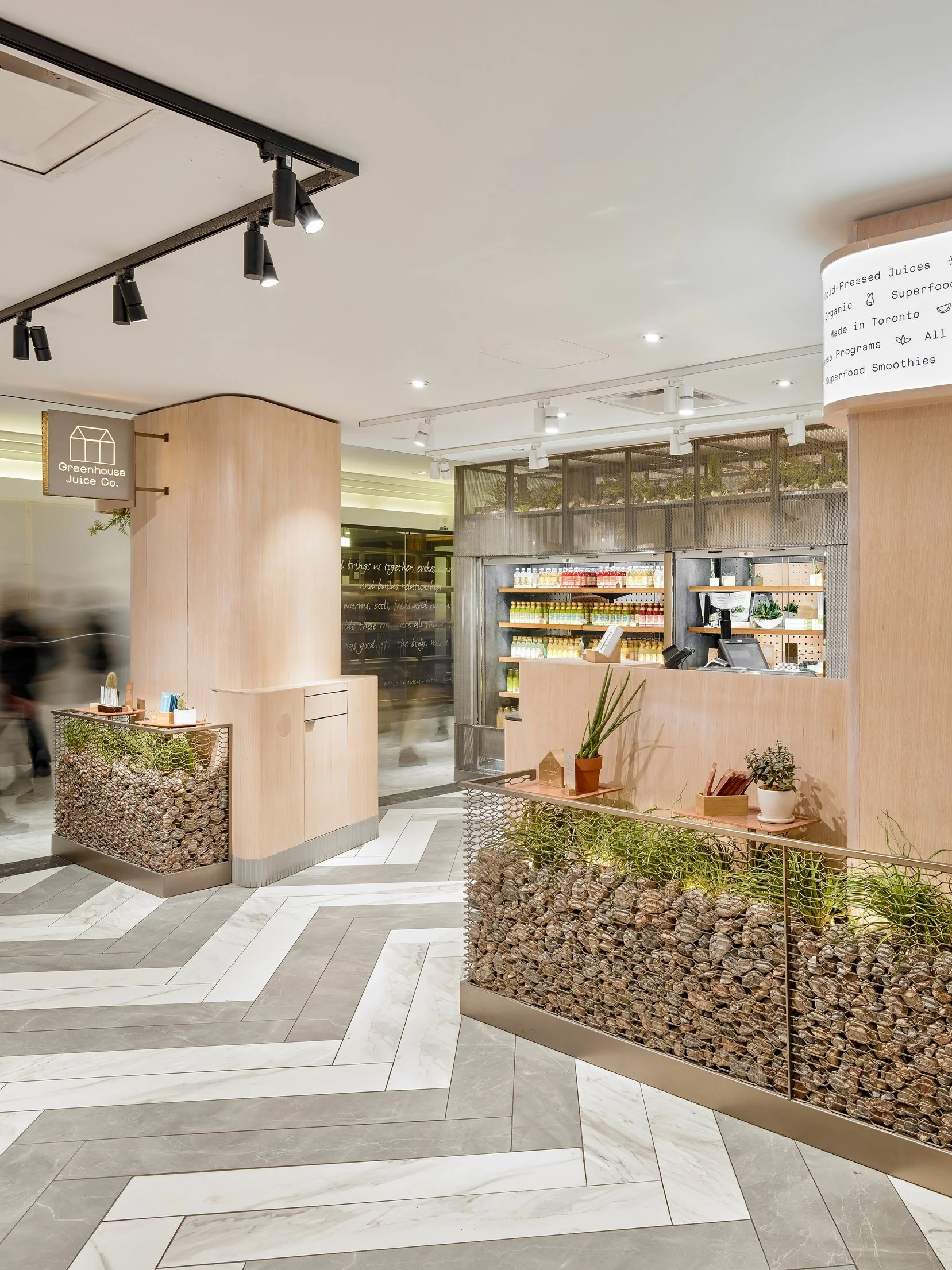 Glacier is a juice shop that occupies a prominent corner in Toronto’s underground PATH at Pusateri’s Saks Fifth Avenue, designed to spark curiosity for the site’s 50,000 daily commuters. White oak millwork wraps the space in warm, generous curves, framed by metal baskets cradling river rock and soft grasses — a distinct interior moment that compares the concourse’s pedestrian movement to a landscape carved by water. Inside the shop, we subtly integrated digital screens, signage, and a refined point-of-sale counter, cultivating a calm but engaging brand experience.