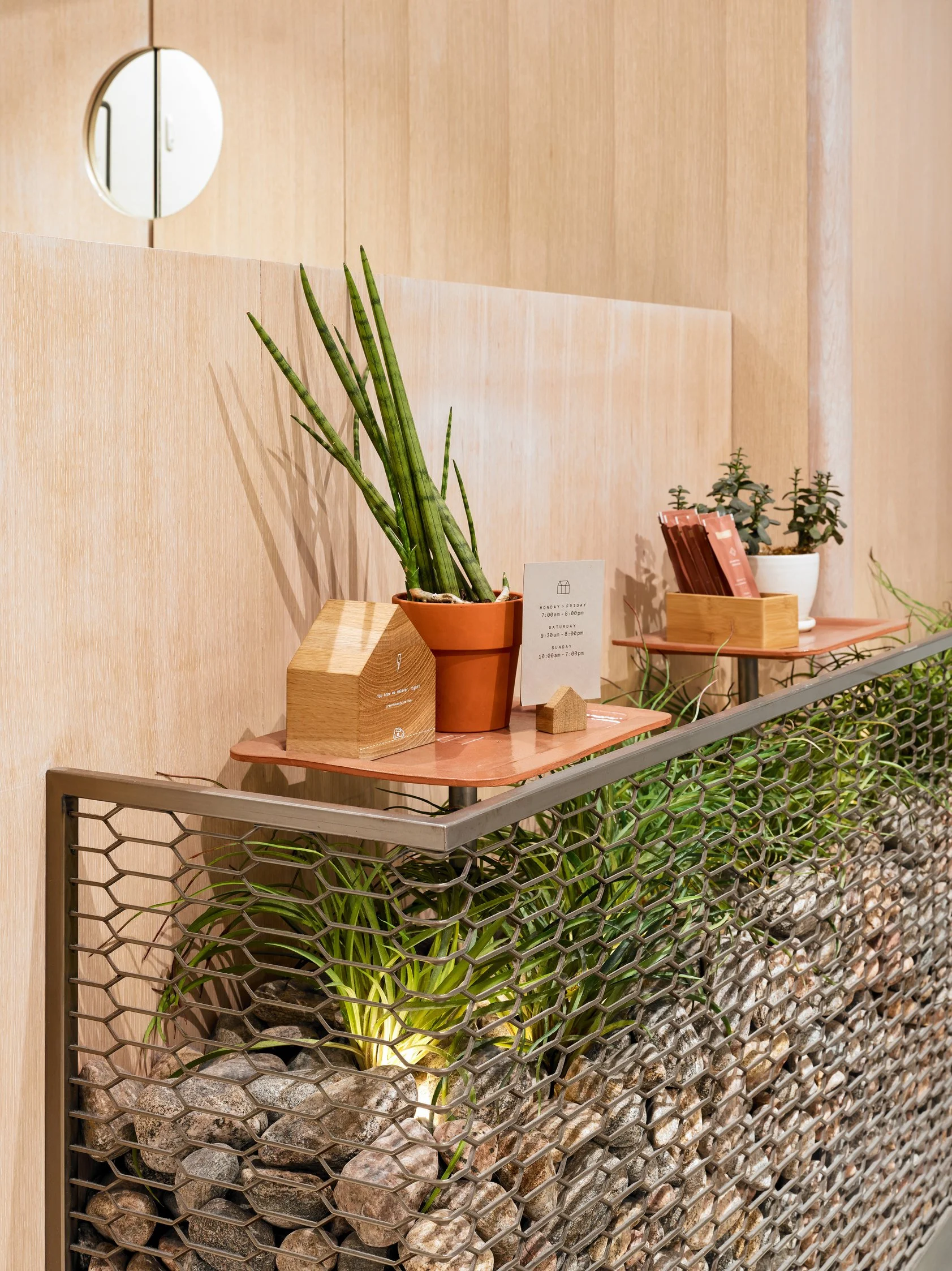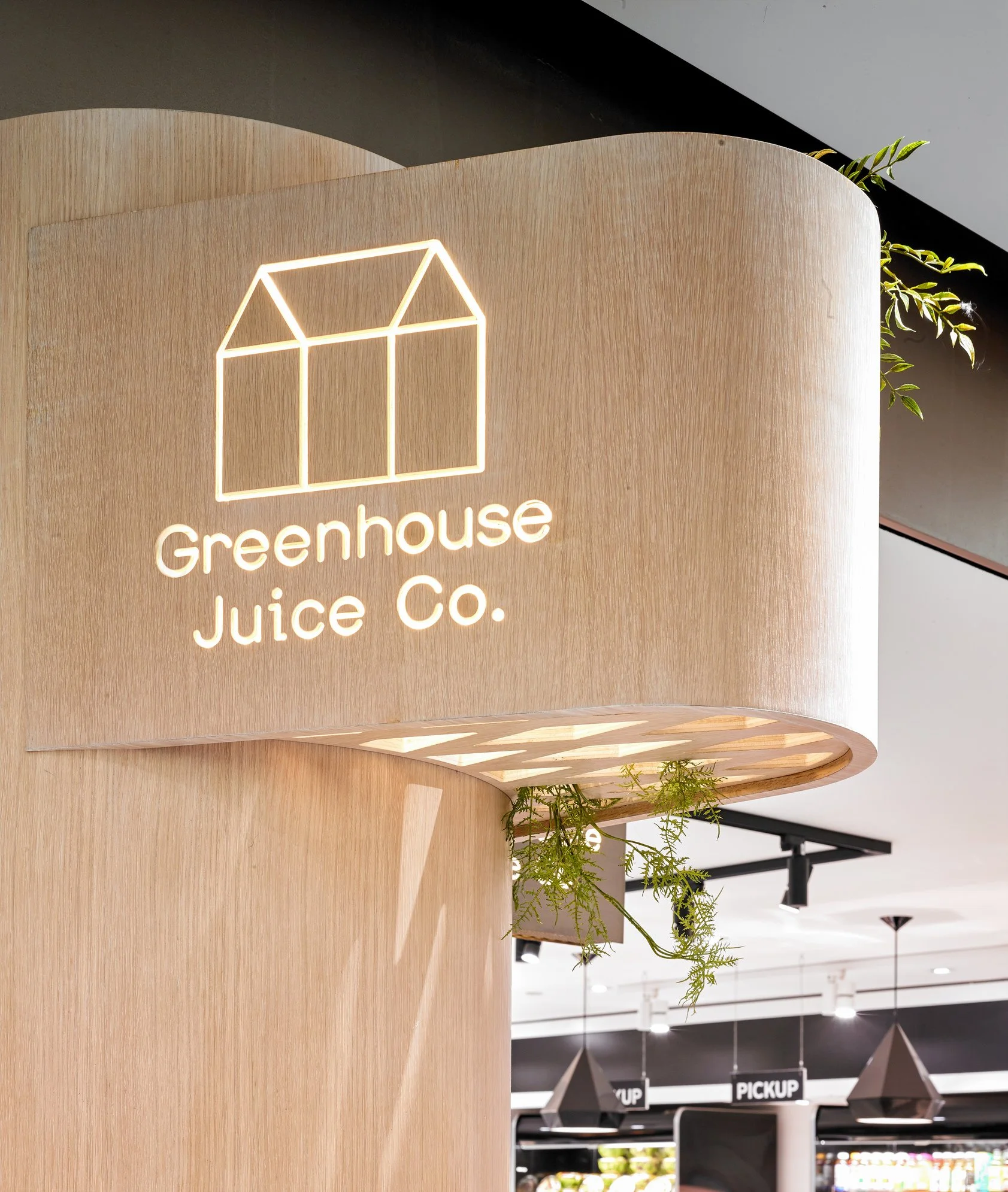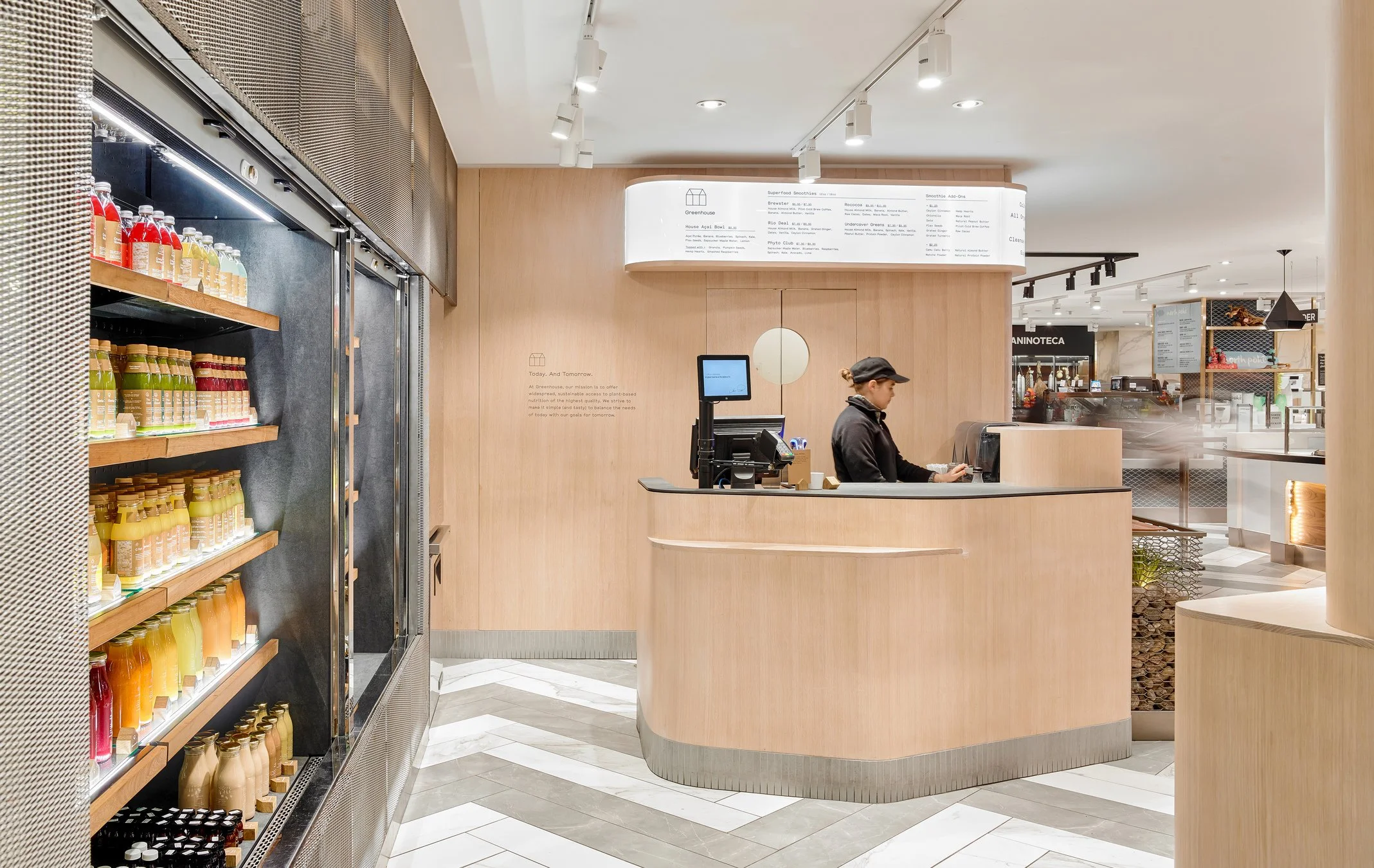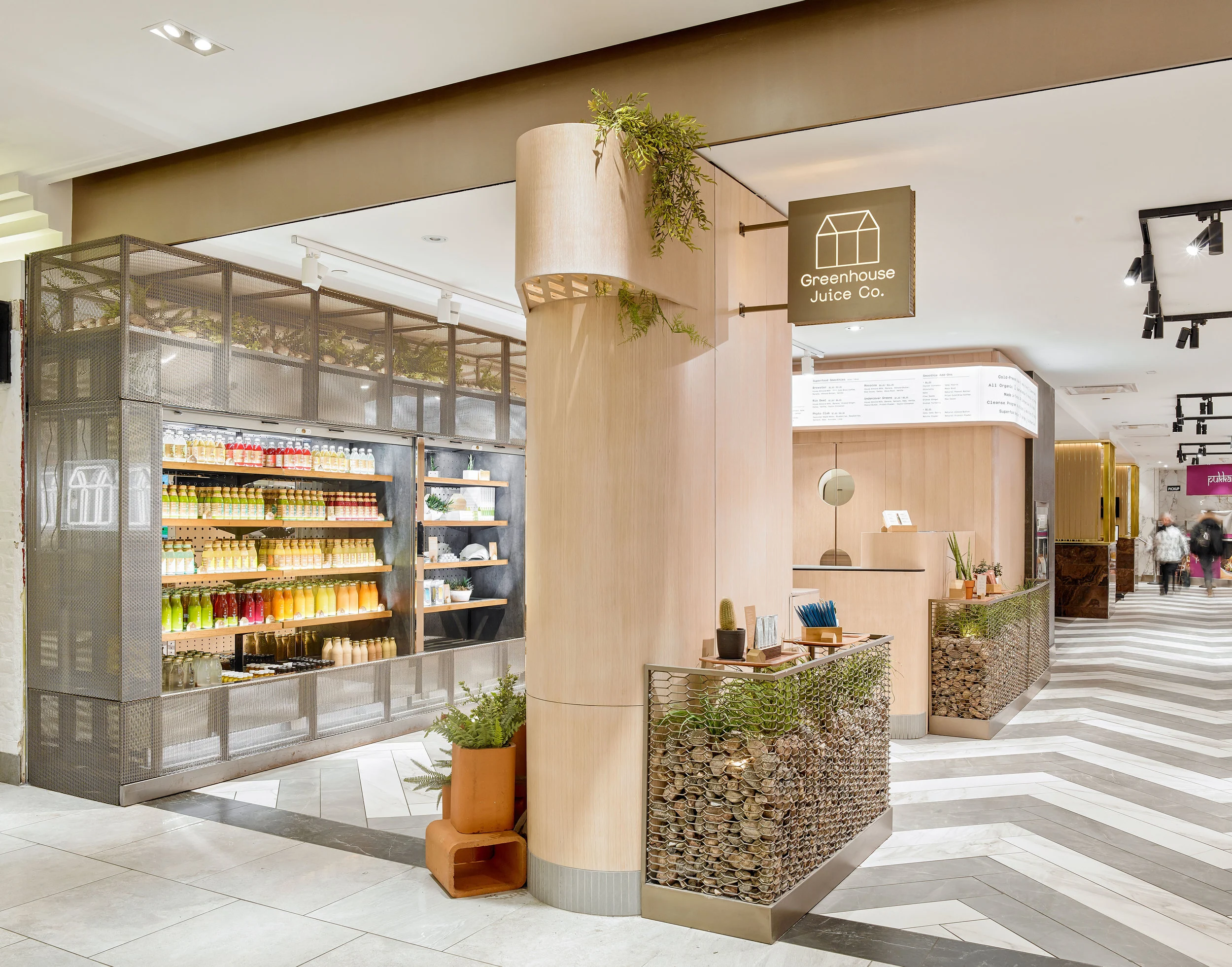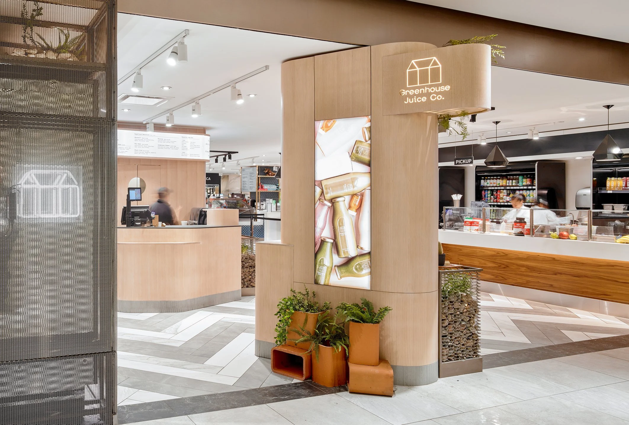 Glacier is a juice shop that occupies a prominent corner in Toronto’s underground PATH at Pusateri’s Saks Fifth Avenue, designed to spark curiosity for the site’s 50,000 daily commuters. White oak millwork wraps the space in warm, generous curves, framed by metal baskets cradling river rock and soft grasses — a distinct interior moment that compares the concourse’s pedestrian movement to a landscape carved by water. Inside the shop, we subtly integrated digital screens, signage, and a refined point-of-sale counter, cultivating a calm but engaging brand experience.