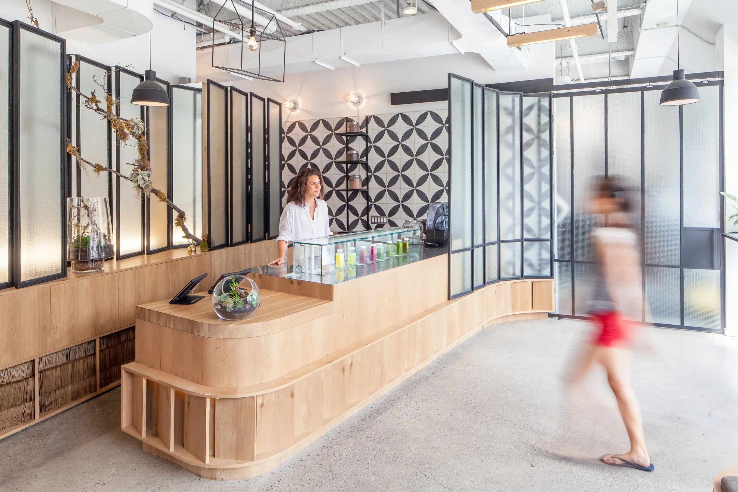 At this Spadina Village juicery, layered geometries and cloudy wired glass cultivate an unpretentious atmosphere full of visual intrigue.
