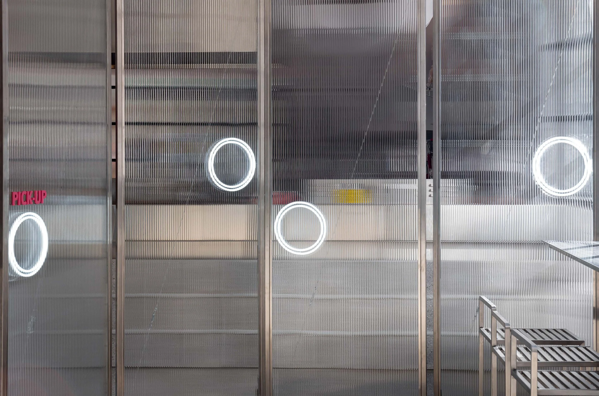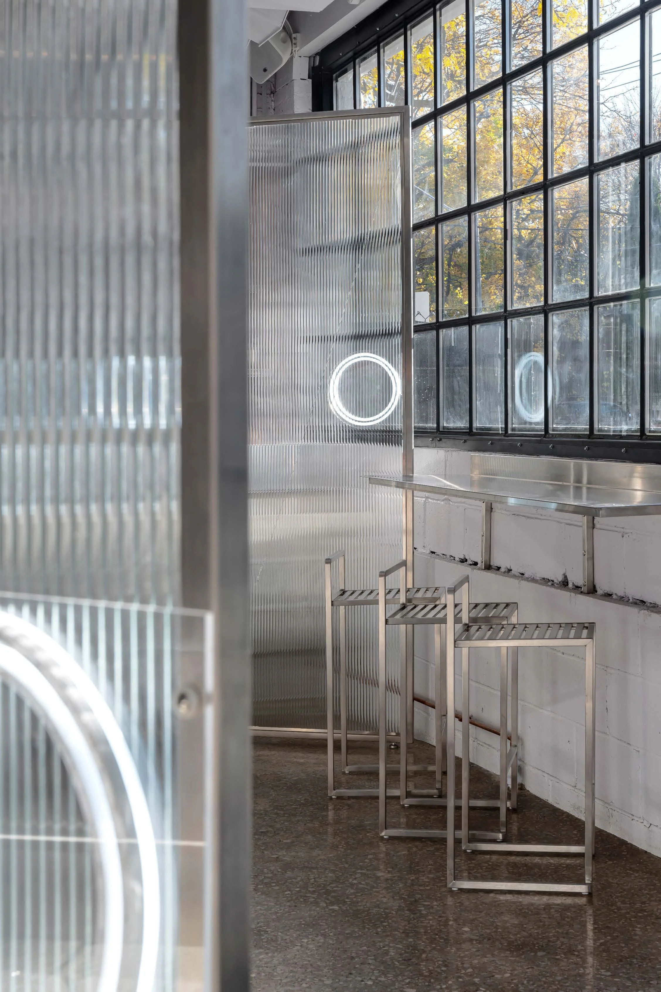 Defunct mechanic garages have found new life as some of Toronto’s most beloved breweries, cafes, and restaurants. For COPS Doughnuts, we transformed an industrial downtown relic into a neighbourhood doughnut shop that balances refinement and raw character. Translucent glass screens offer a glimpse of production while disguising the overall kitchen space. These partitions layer upon concrete and stucco to establish a striking, monochromatic backdrop that allows the shop’s colourful products to stand out.