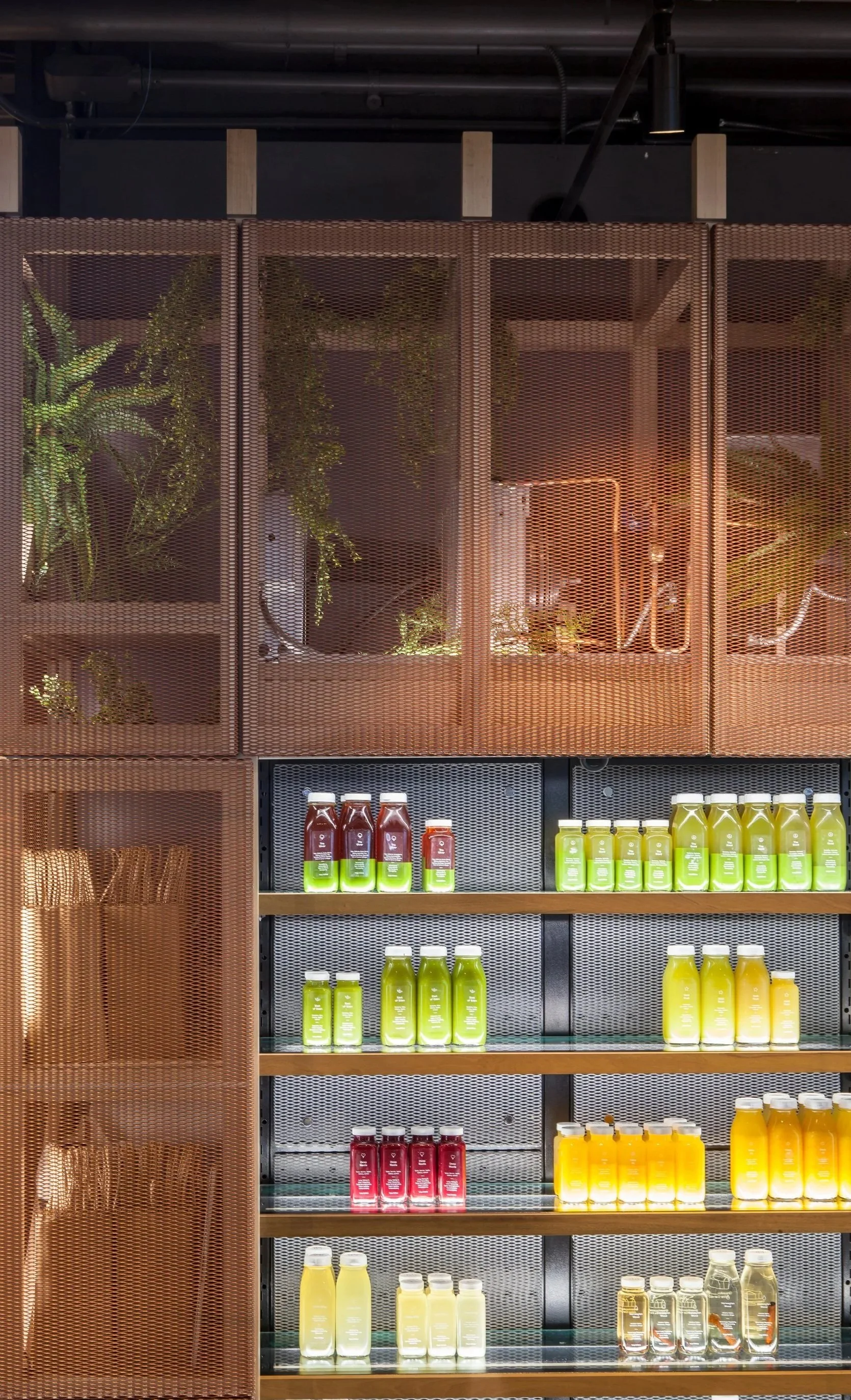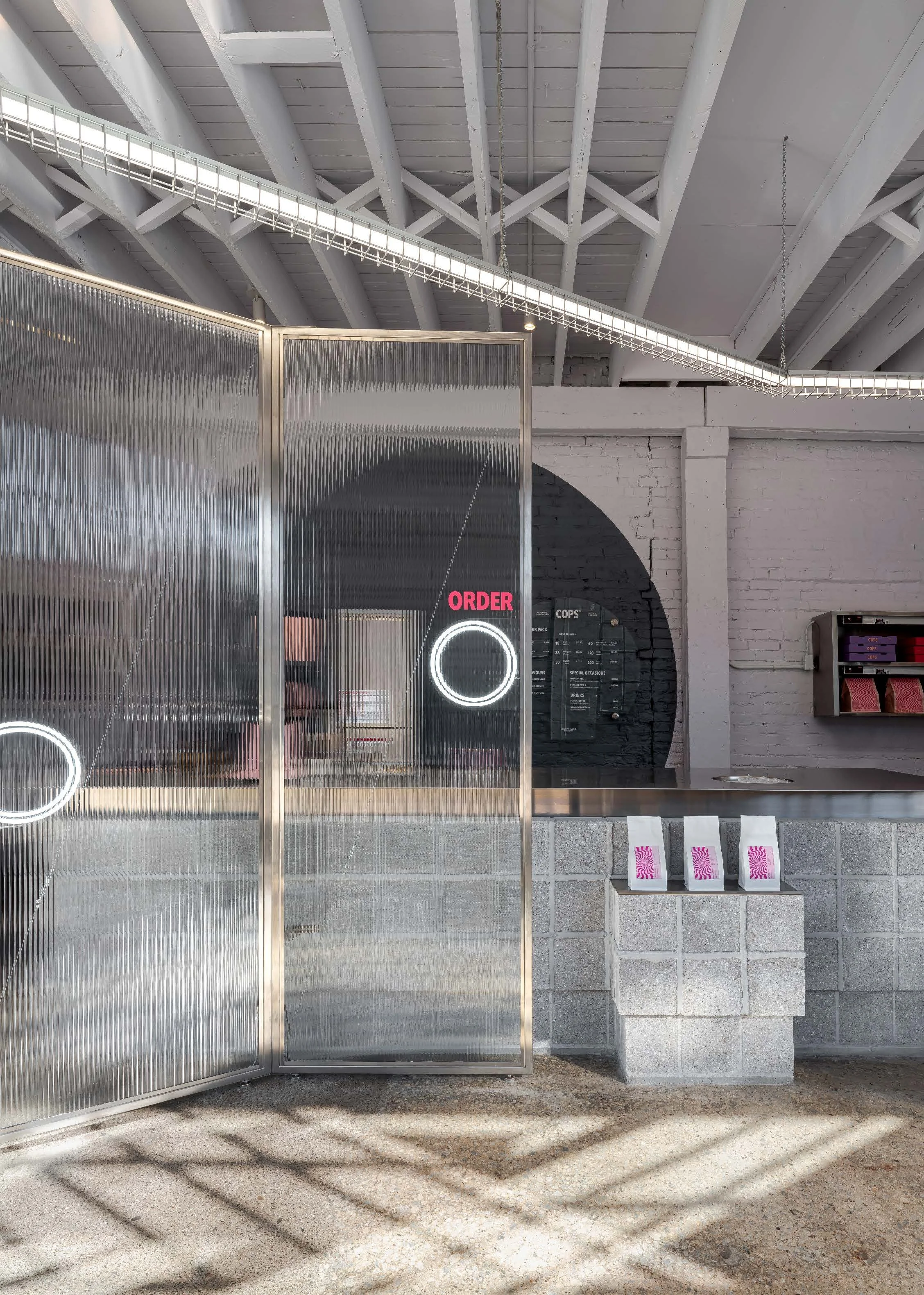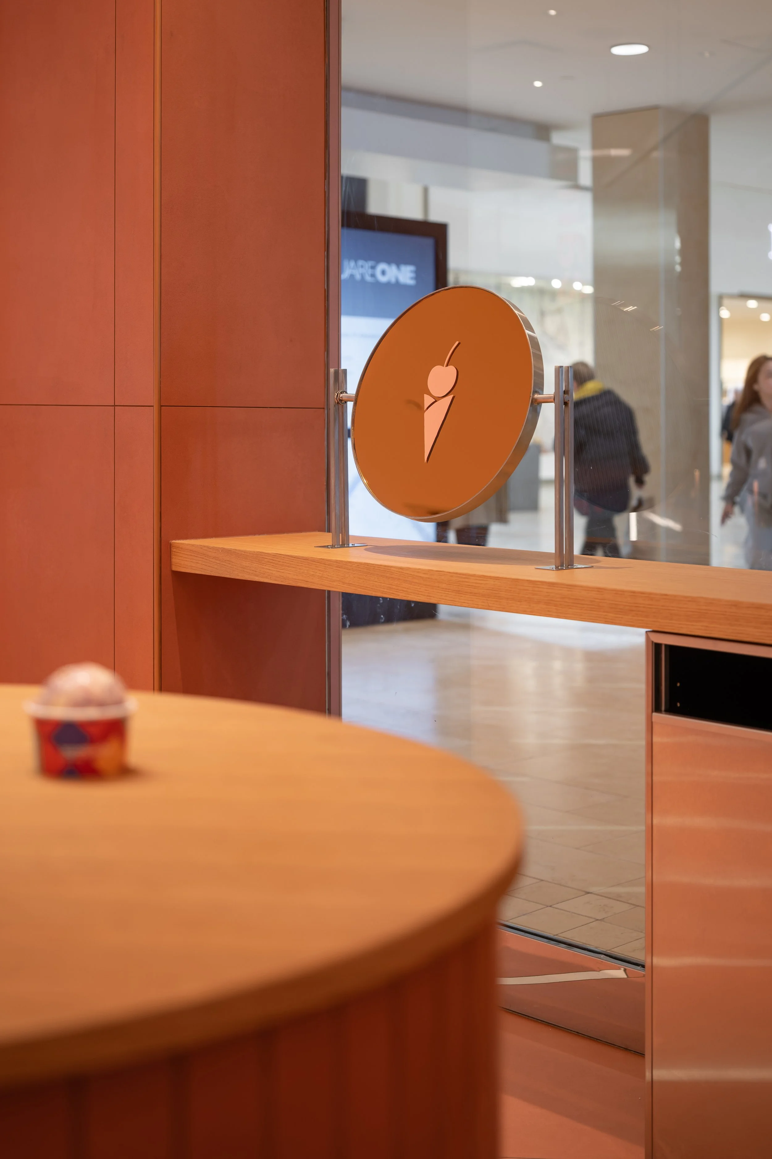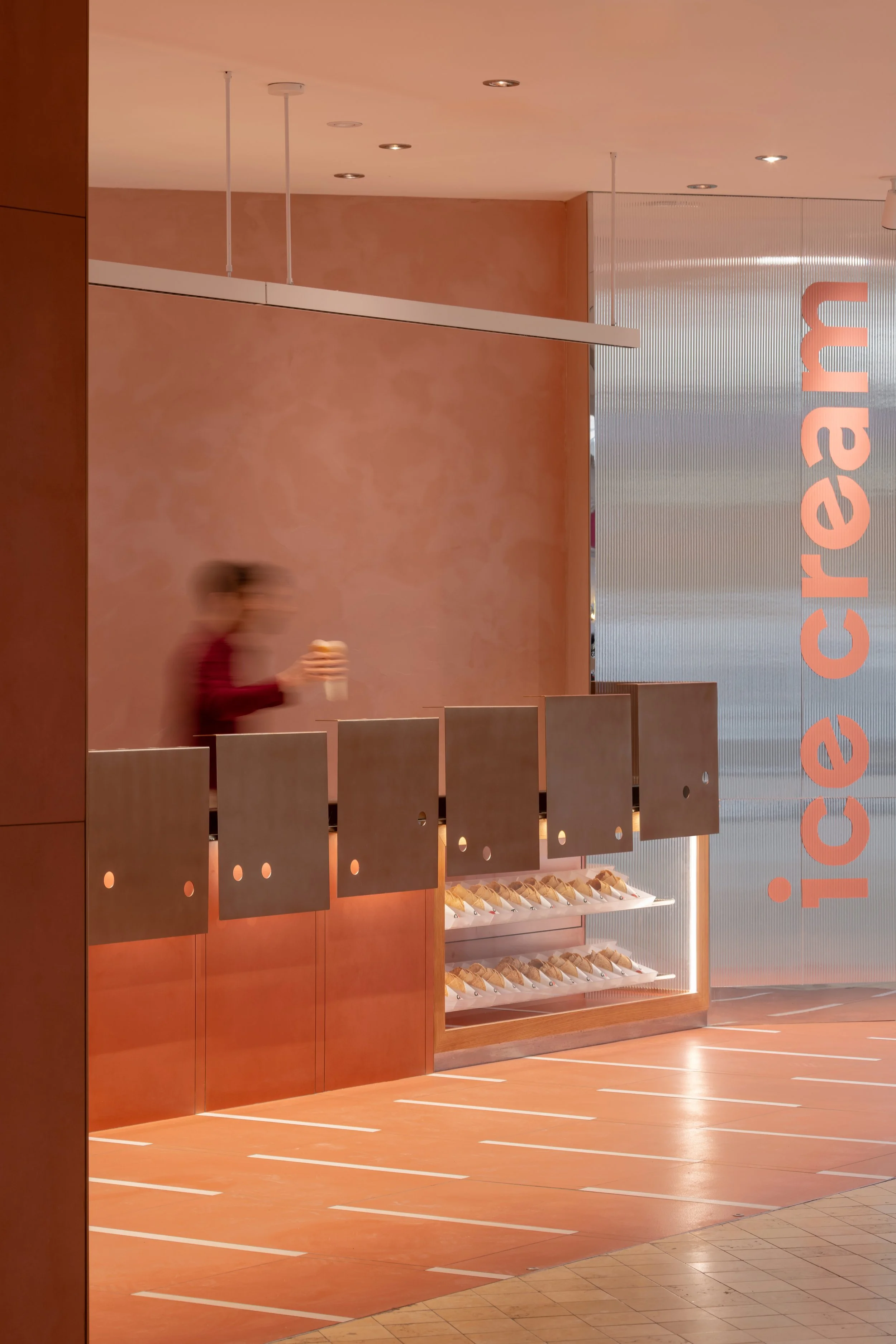 Our response is a playful and contemporary space that brings together shimmering mirrored surfaces, textured coral microcement, warm terracotta floors, and custom fluted glass; details that spark whimsy and create an immersive environment that entices passersby and elevates the simple joy of ice cream.