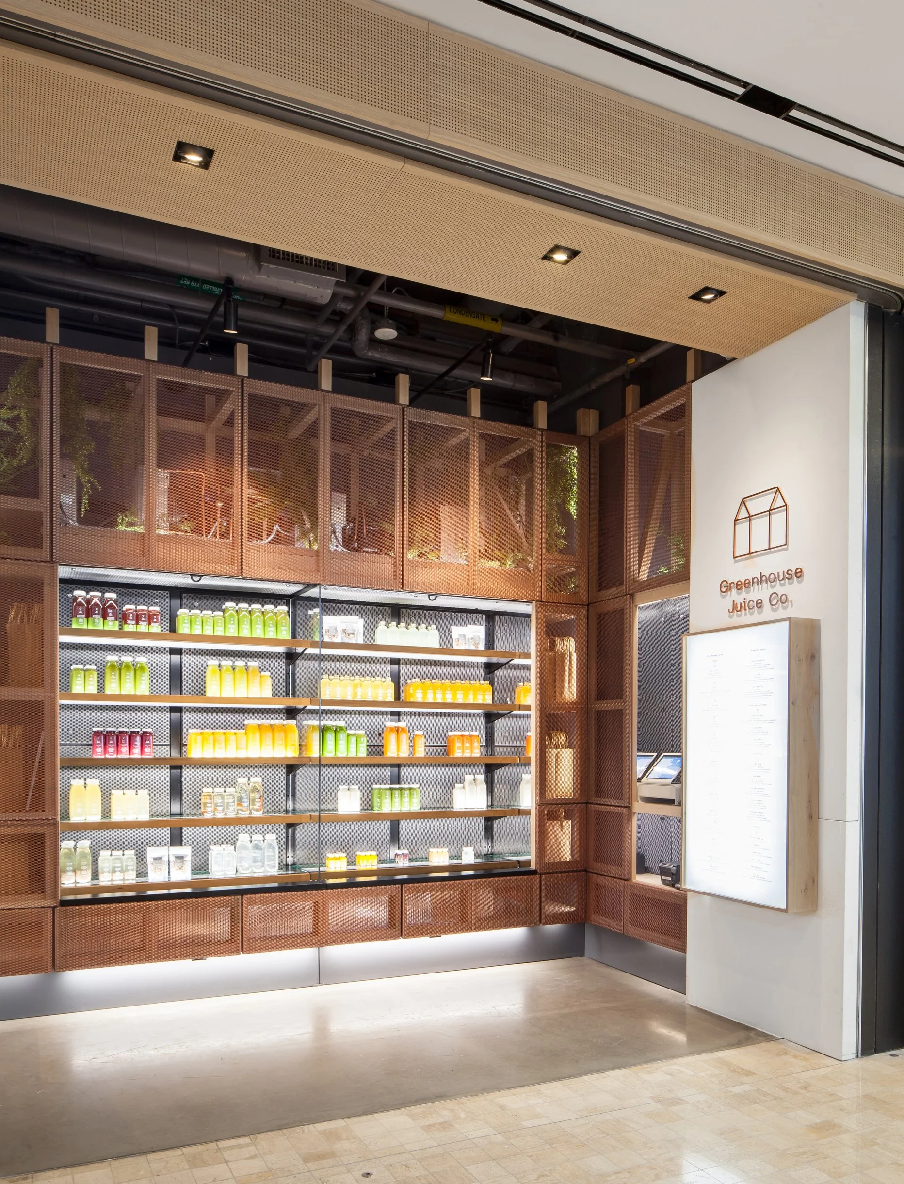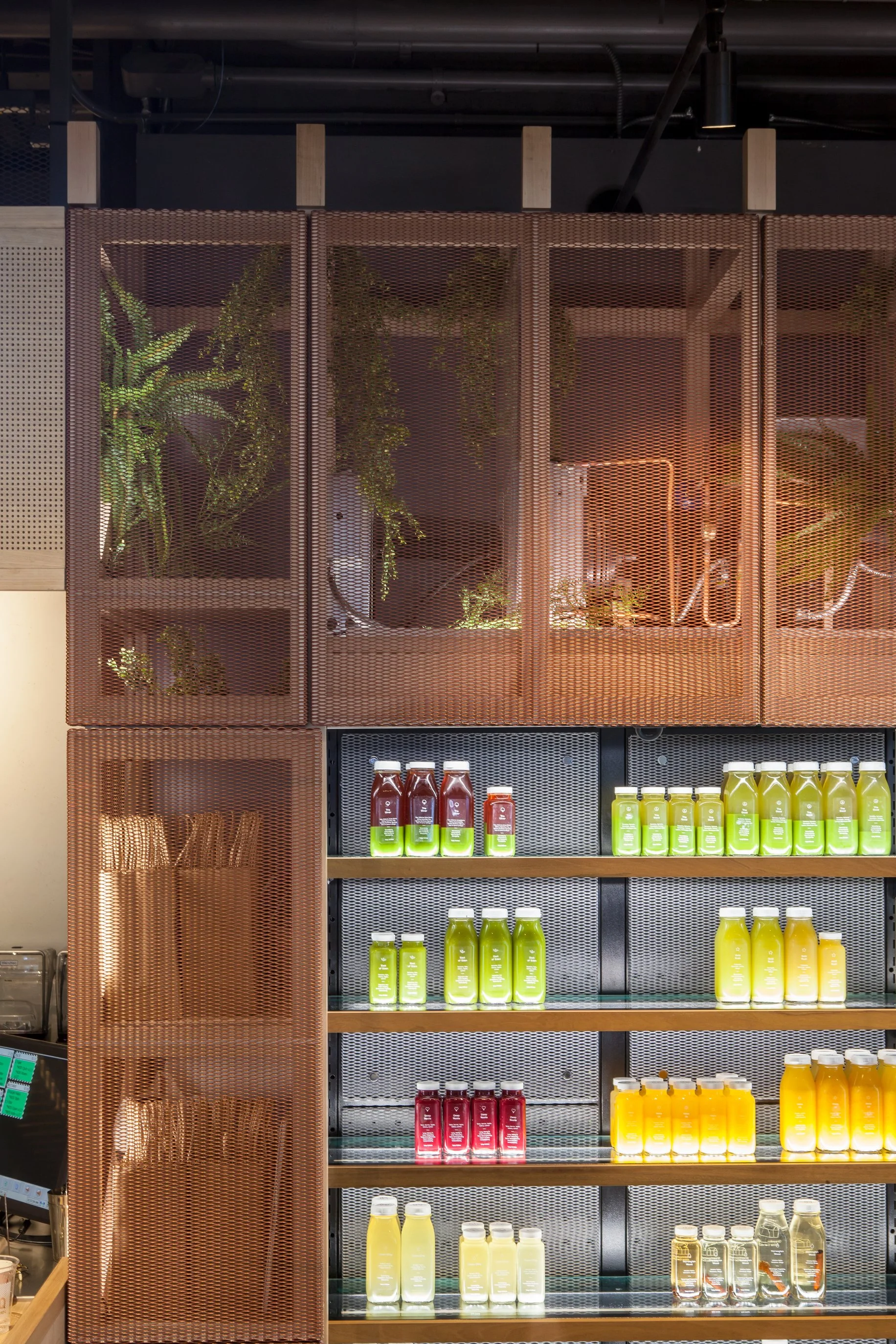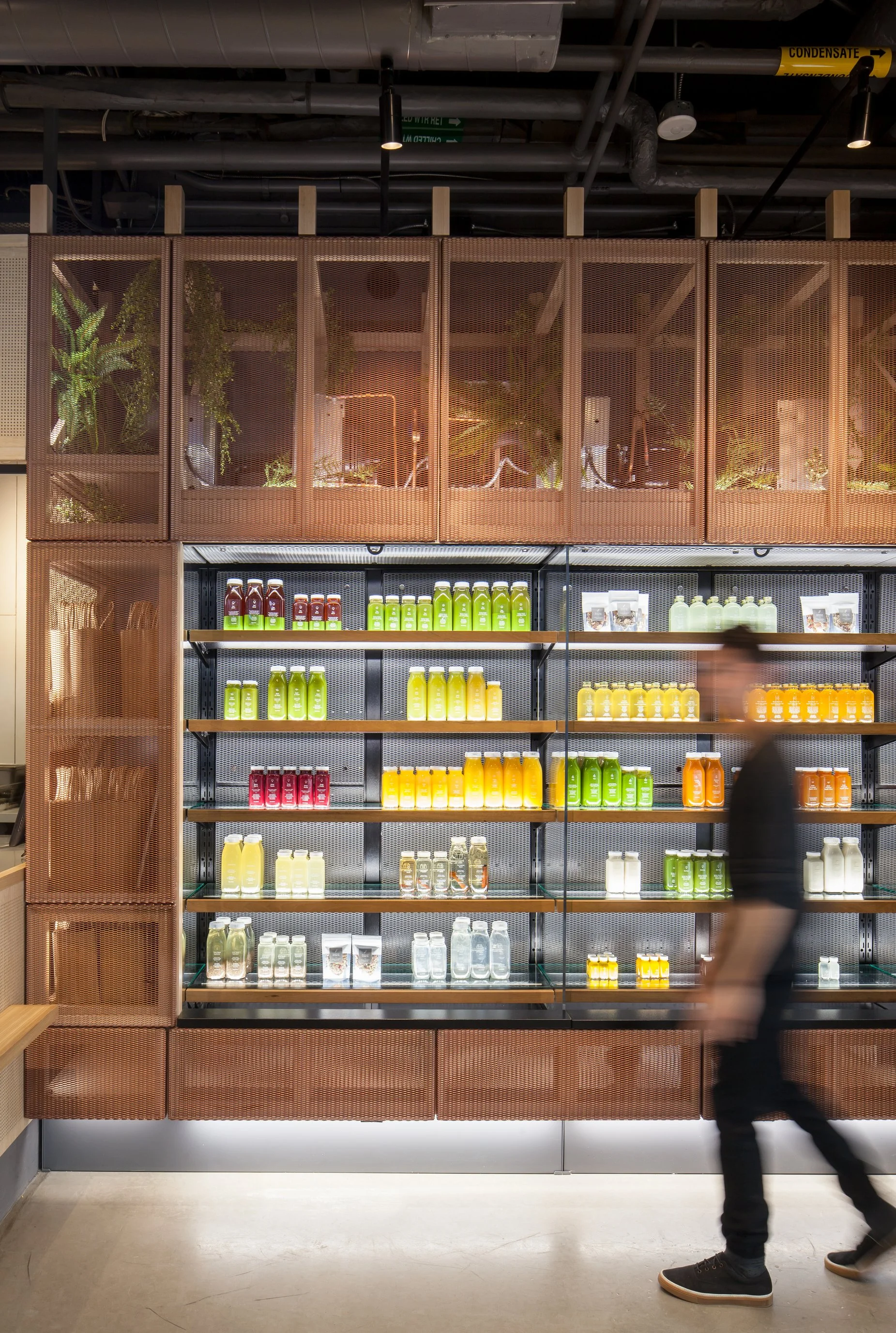 Located in First Canadian Place, Night Scene brings together two beloved Toronto health food purveyors in a coordinated space full of warmth and intrigue. The central white service counter establishes presence from the pedestrian footpath, softened by glowing cove lighting and perforated wood. We unified the branding and menus through a shared language of copper and white oak. Corresponding copper mesh millwork adds mystery and contrast, curiously revealing ferns and other plants living among the shop’s utility infrastructure.