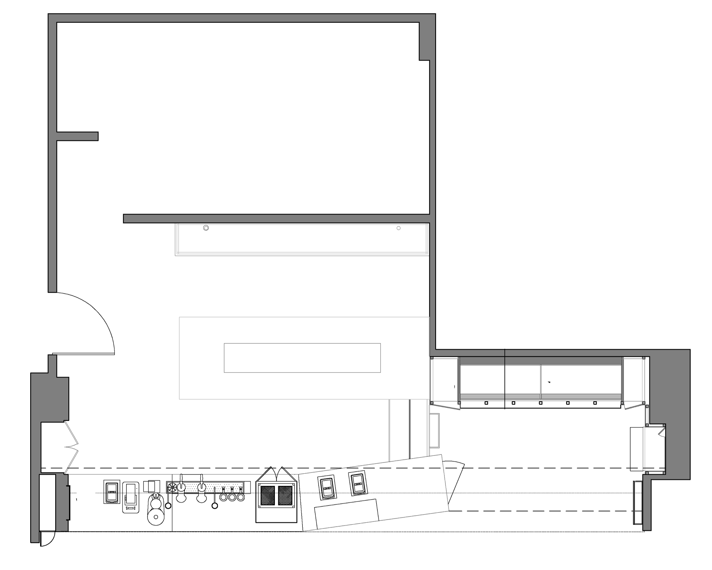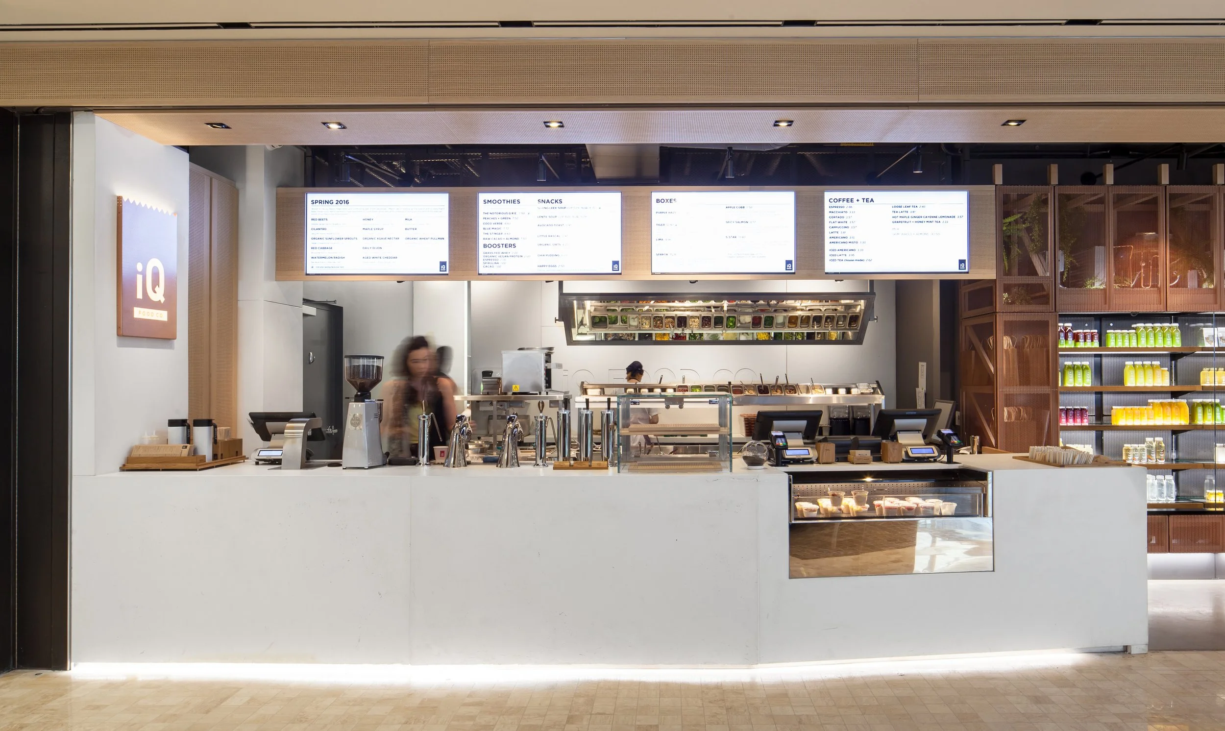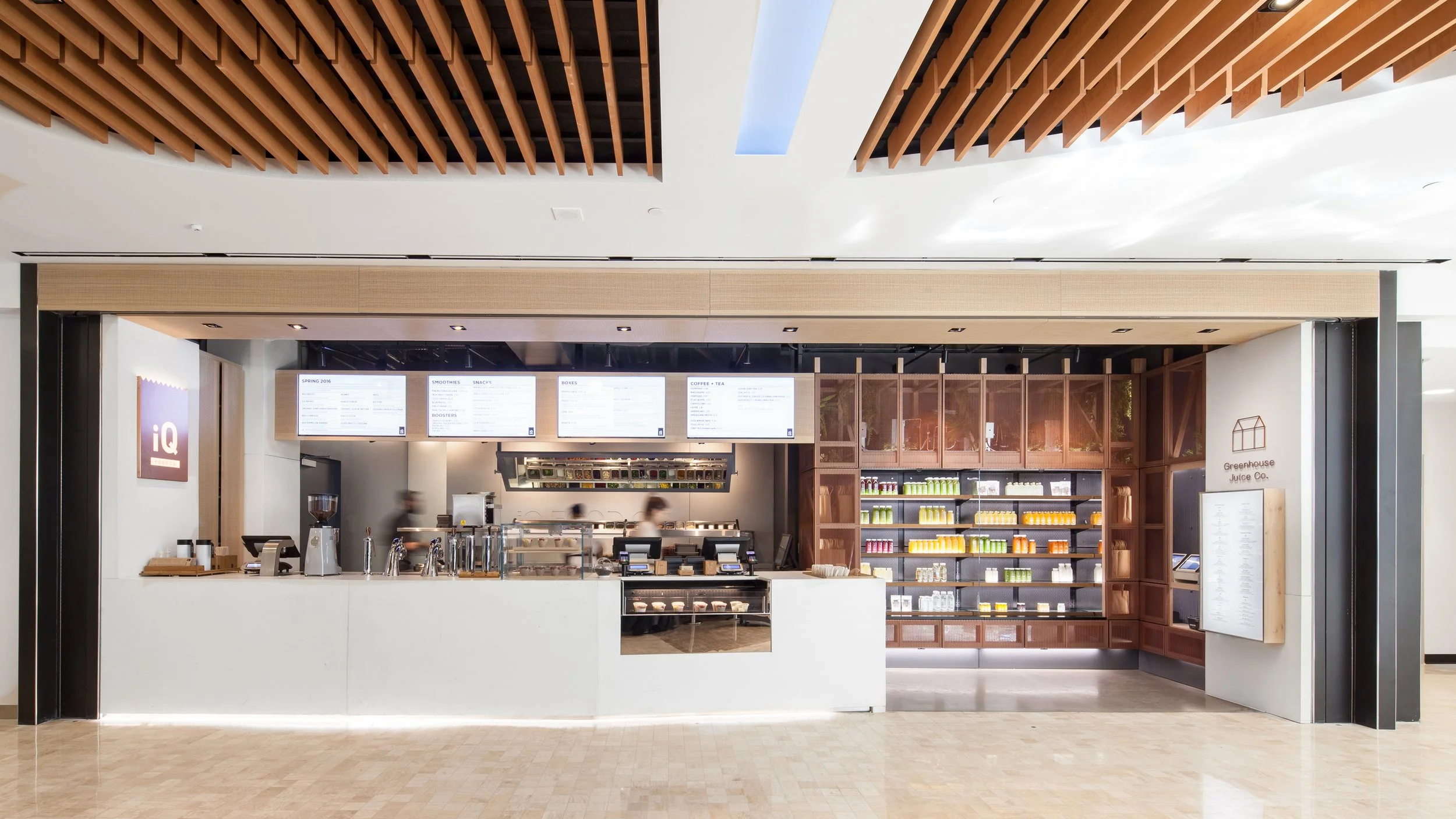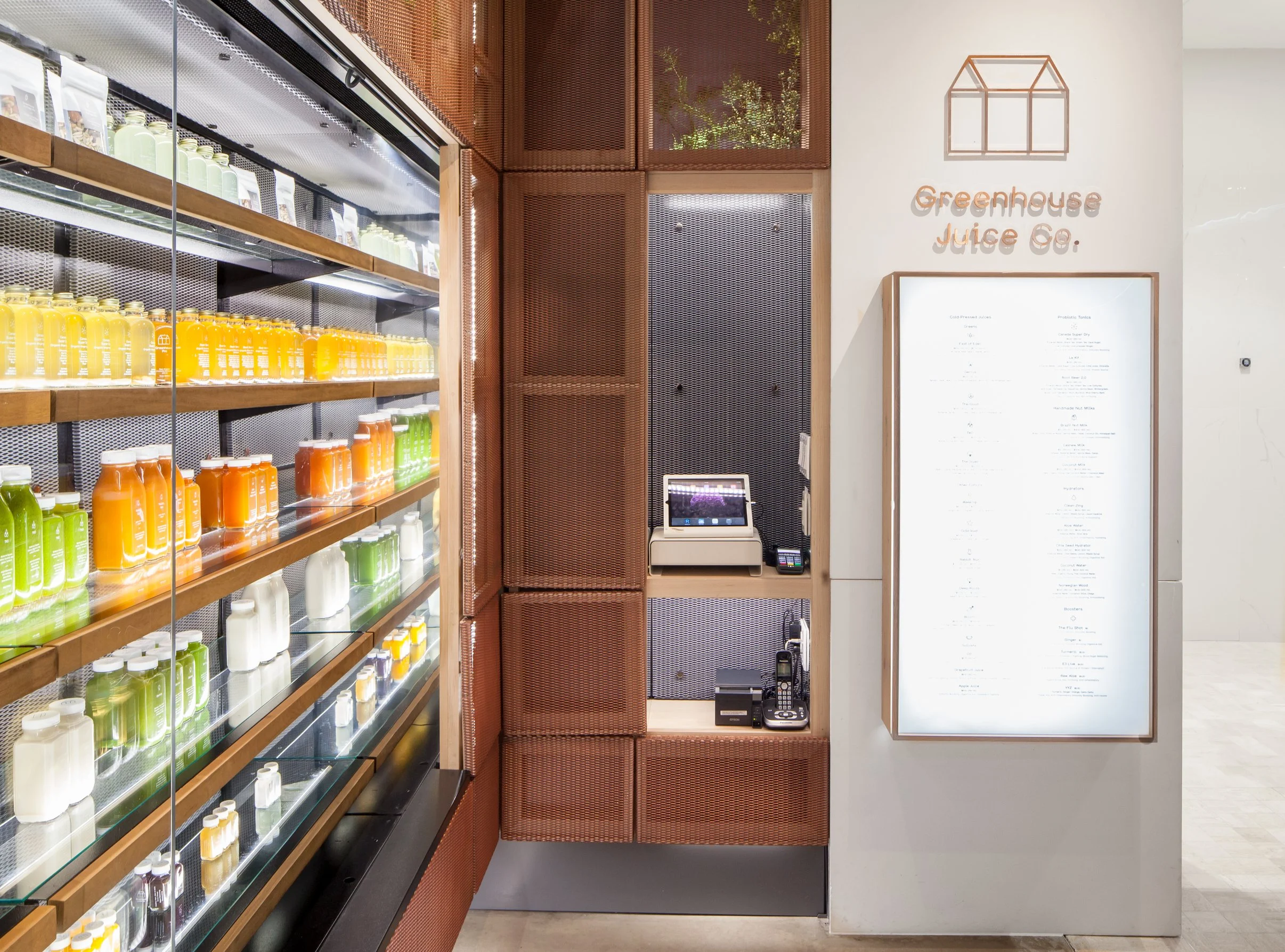 Located in First Canadian Place, Night Scene brings together two beloved Toronto health food purveyors in a coordinated space full of warmth and intrigue. The central white service counter establishes presence from the pedestrian footpath, softened by glowing cove lighting and perforated wood. We unified the branding and menus through a shared language of copper and white oak. Corresponding copper mesh millwork adds mystery and contrast, curiously revealing ferns and other plants living among the shop’s utility infrastructure.