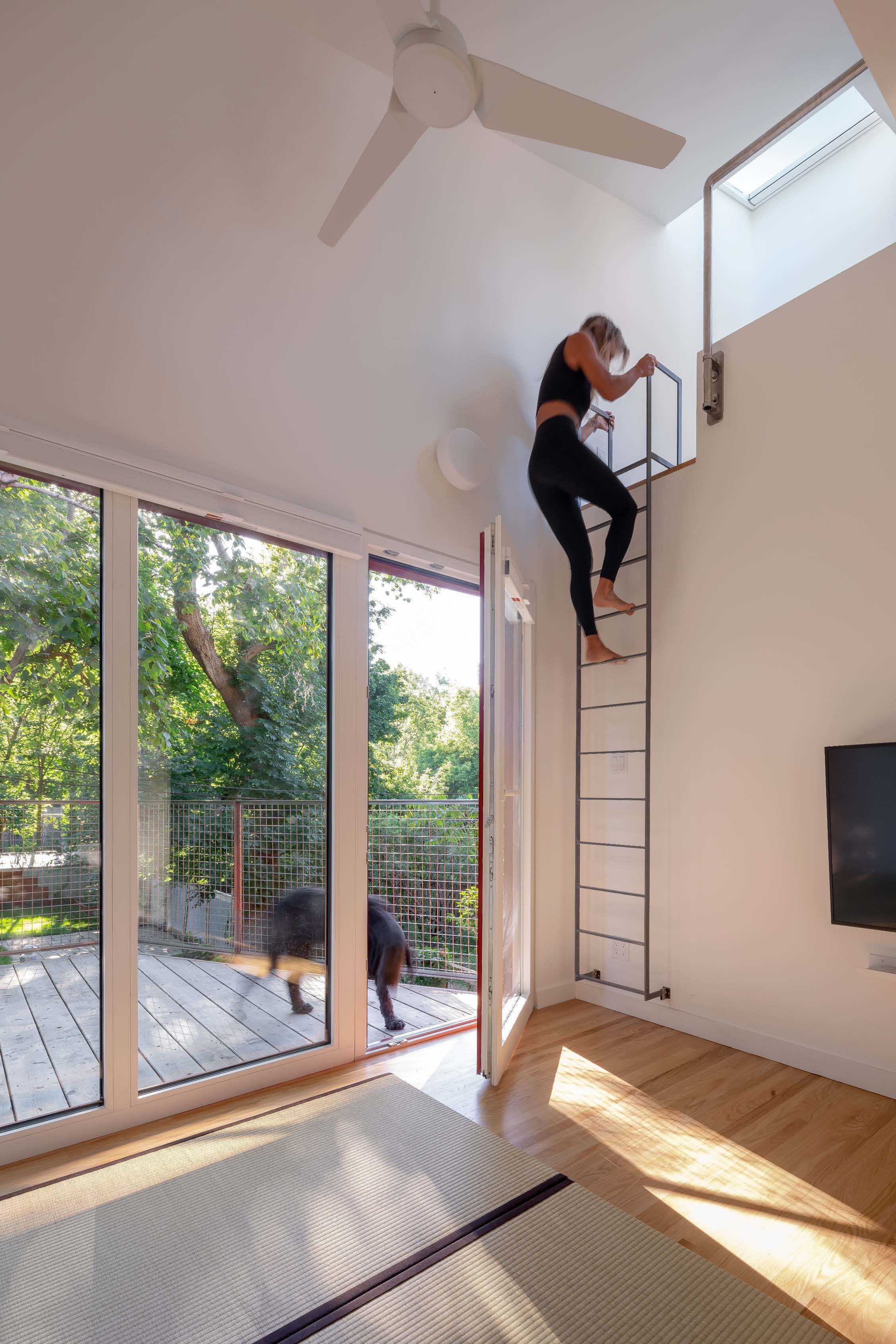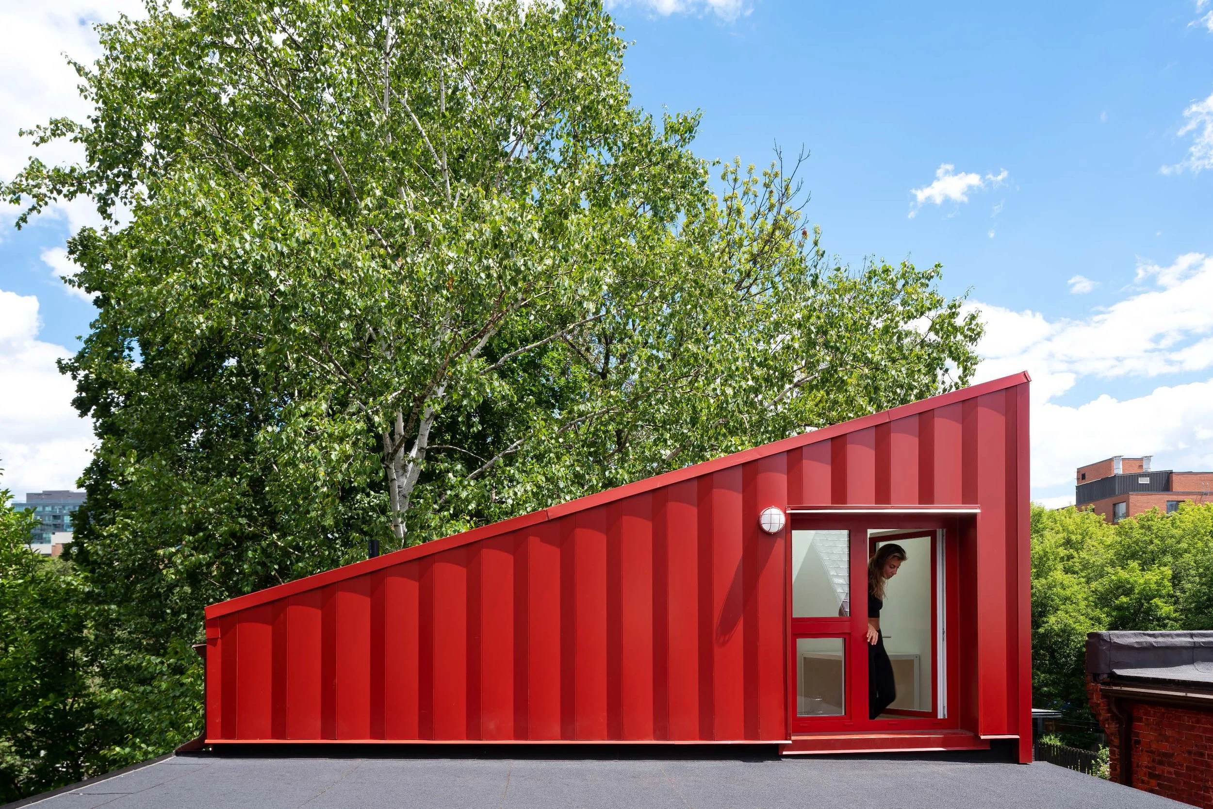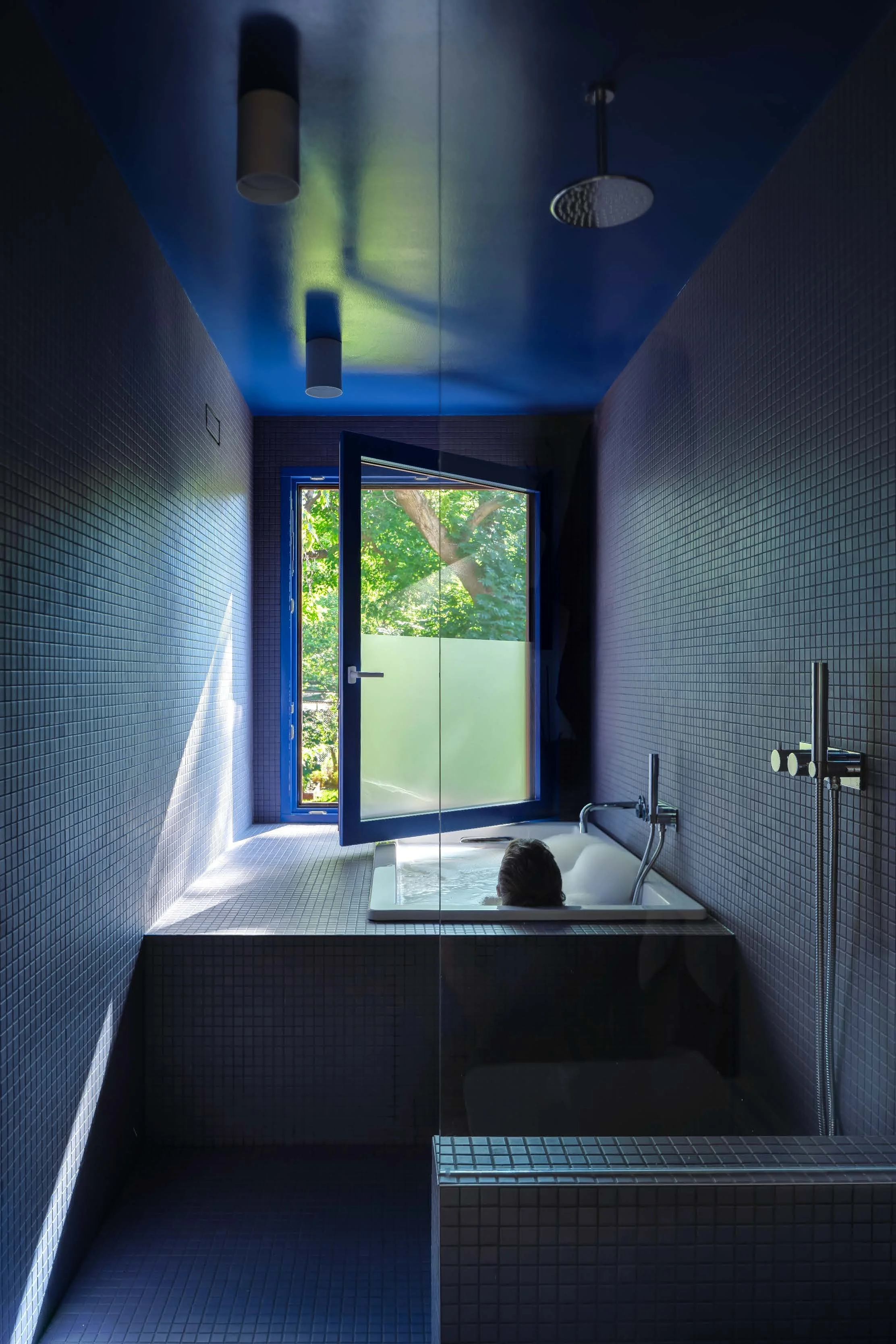Glimmer House explores how a home can adapt to different definitions of family, designed for a couple, their large dog, and frequent long-term guests. The vibrant addition playfully reinterprets local Victorian masonry and provides an abundance of glimmering light through large apertures and its angular form. The home’s dark, glossy kitchen reflects outdoor vistas, and a tranquil, grotto-like bathroom opens to the tree canopy — interventions which balance the home’s opportunities for social connection, solitude, and communion with nature.