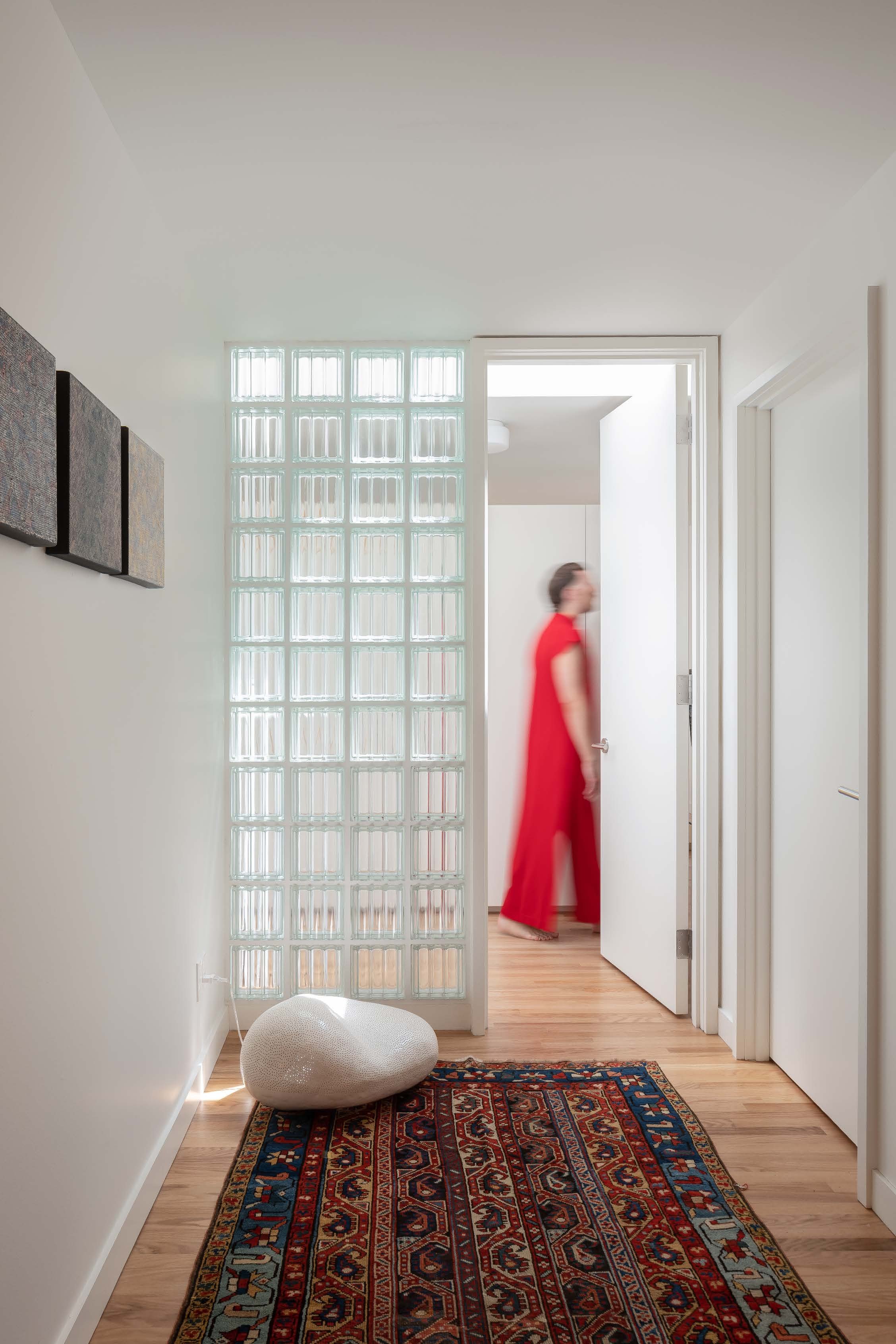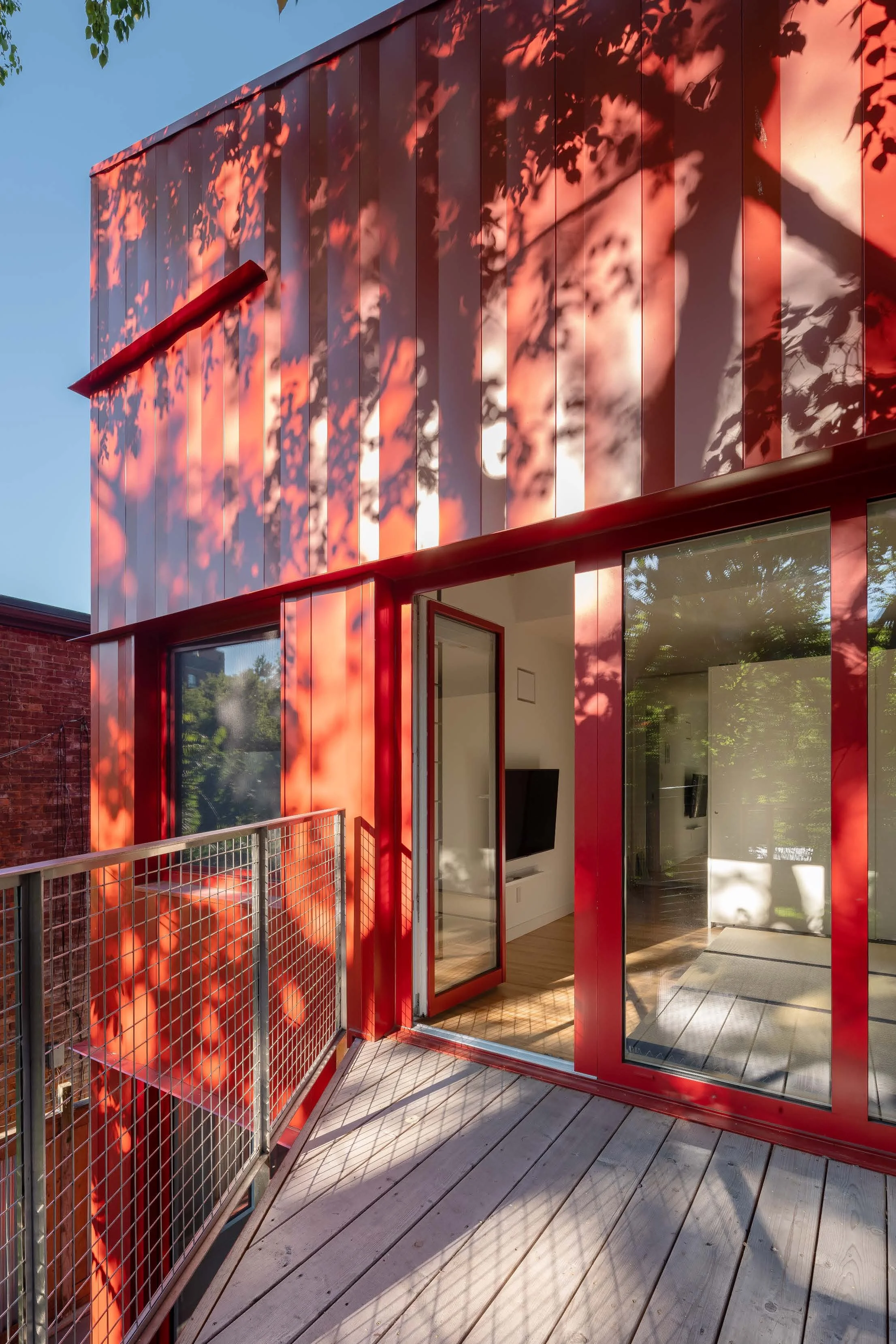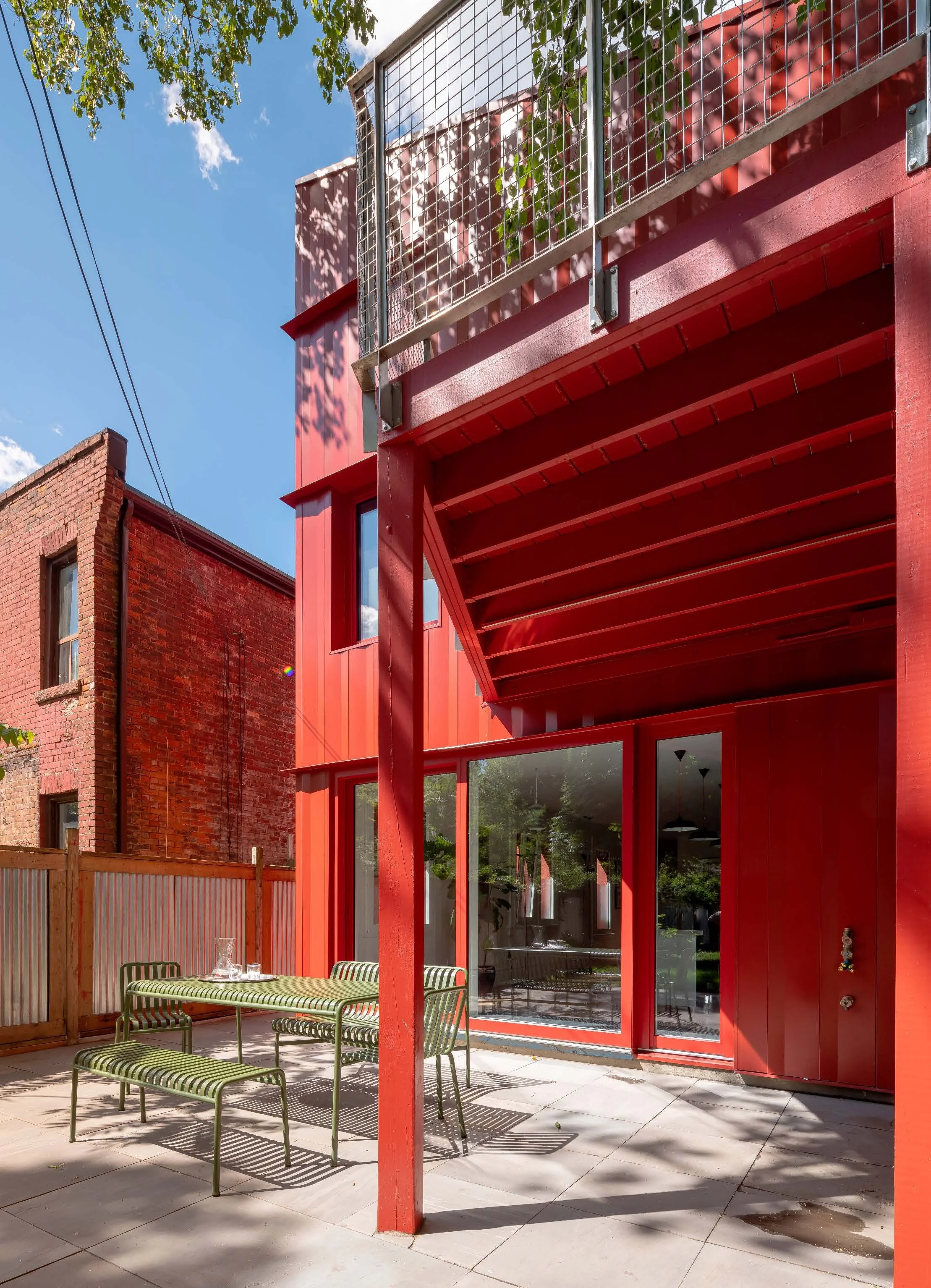 Glimmer House explores how a home can adapt to different definitions of family, designed for a couple, their large dog, and frequent long-term guests. The vibrant addition playfully reinterprets local Victorian masonry and provides an abundance of glimmering light through large apertures and its angular form. The home’s dark, glossy kitchen reflects outdoor vistas, and a tranquil, grotto-like bathroom opens to the tree canopy — interventions which balance the home’s opportunities for social connection, solitude, and communion with nature.