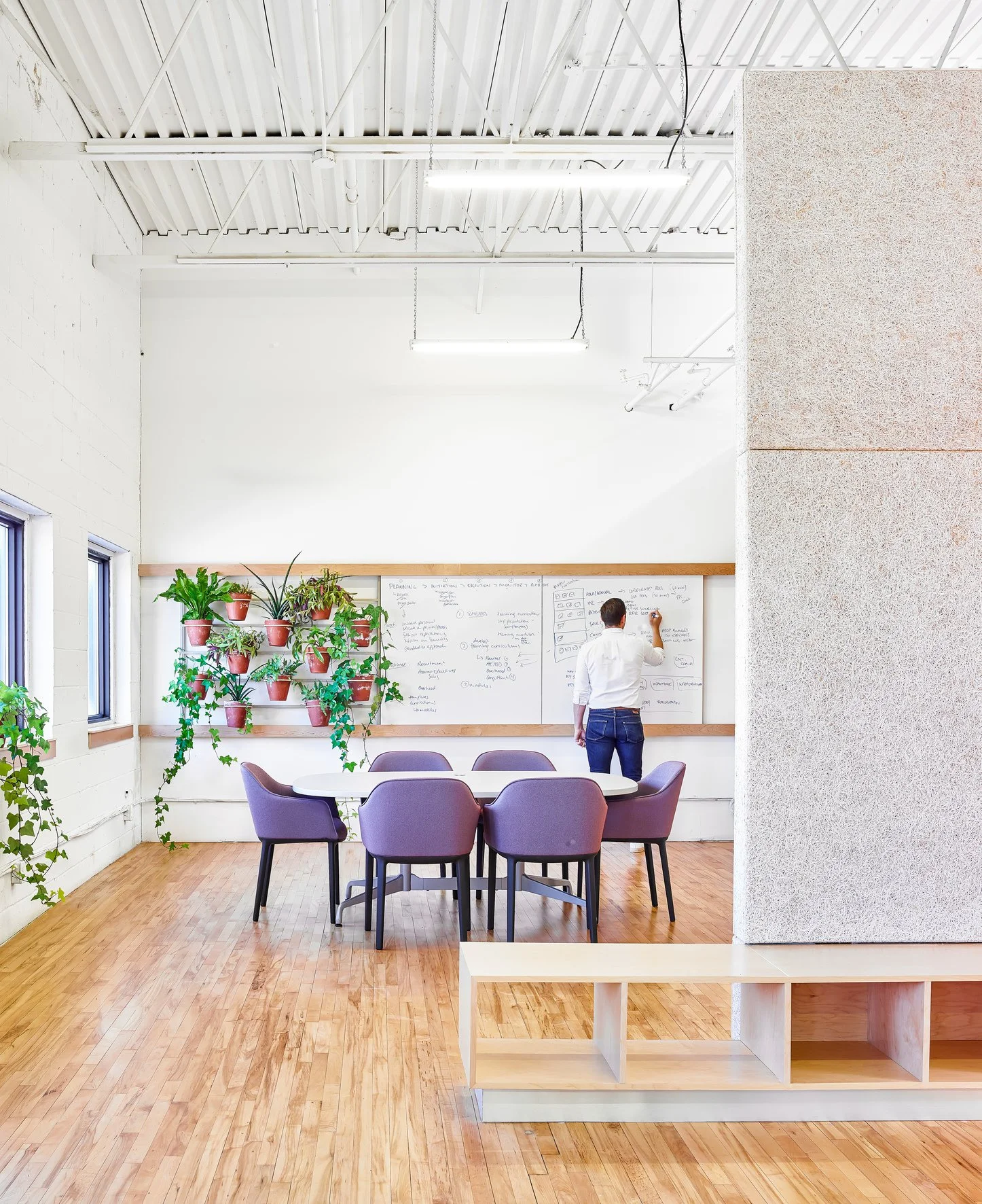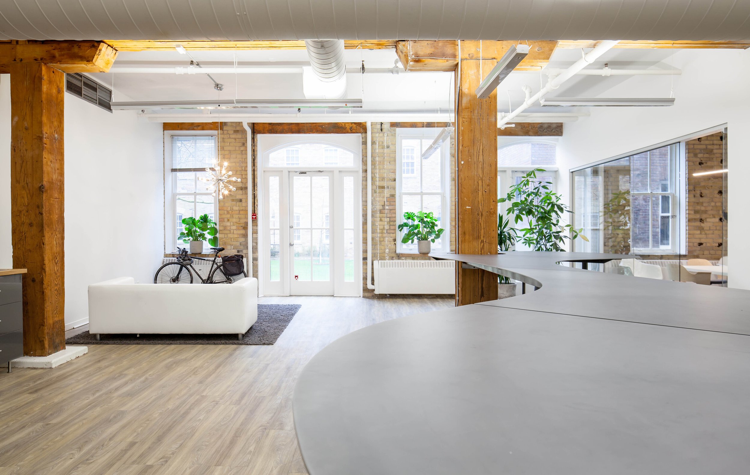 A custom brush steel table anchors our redesign of this busy law office in the historic Berkeley Castle. Integrated around two original columns, the piece highlights the building’s heritage while introducing a contemporary focal point, one which appears to float. Its curving surface is composed of six interconnected pieces, assembled on-site and designed to minimize material waste. Extending more than 20 feet, it accommodates up to 18 people and transforms the centre of the office into a flexible zone for co-working and socializing.